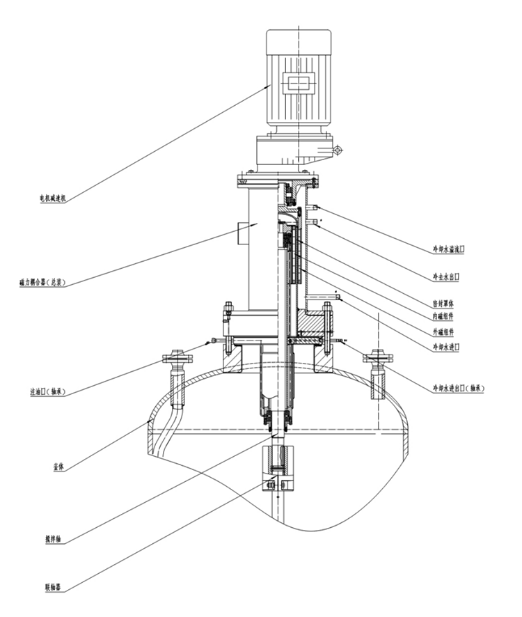 用稀土永磁制作的強(qiáng)磁回轉(zhuǎn)式耦合結(jié)構(gòu)(磁力驅(qū)動(dòng)裝置),磁力驅(qū)動(dòng)裝置的基本制造材料均為鐵磁性物質(zhì),磁導(dǎo)率極佳,磁場在穿過用于密封合金層時(shí)幾乎沒有損耗。由此外部驅(qū)動(dòng)永磁體產(chǎn)生的旋轉(zhuǎn)磁場可以有效被內(nèi)部永磁體轉(zhuǎn)子接受,進(jìn)而帶動(dòng)反應(yīng)器內(nèi)的攪拌部件進(jìn)行物料混合,攪拌速度為0~300r/min,甚至更高,可配推進(jìn)、槳式、錨式、框式、螺帶等各種槳。